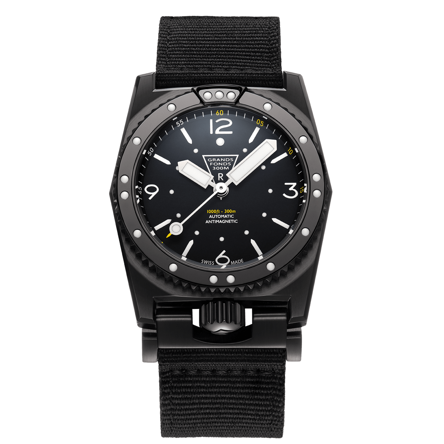 Du style et de la performance caractérisent cette plongeuse. Le cadran, la lunette et le bracelet de la Grands Fonds 300® “Black Phantom s’habillent de noir pour offrir un contraste et une lisibilité maximum. Les index et les aiguilles recouverts de Super-Luminova® se détachent parfaitement dans cette mise en scène monochrome. À l’instar des montres ZRC®, cette référence dispose du système ECS® qui assure un rinçage idéal après une plongée. Le Crown Protection System™ participe à sécuriser son étanchéité. Son bracelet ne peut se fermer que si la couronne est entièrement vissée. Son calibre automatique Swiss Made garantit sa fiabilité.