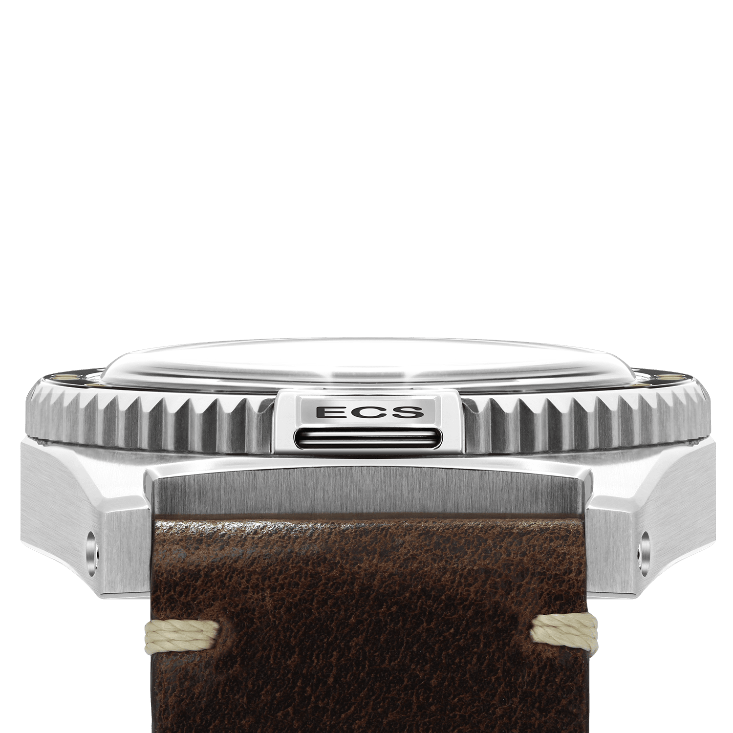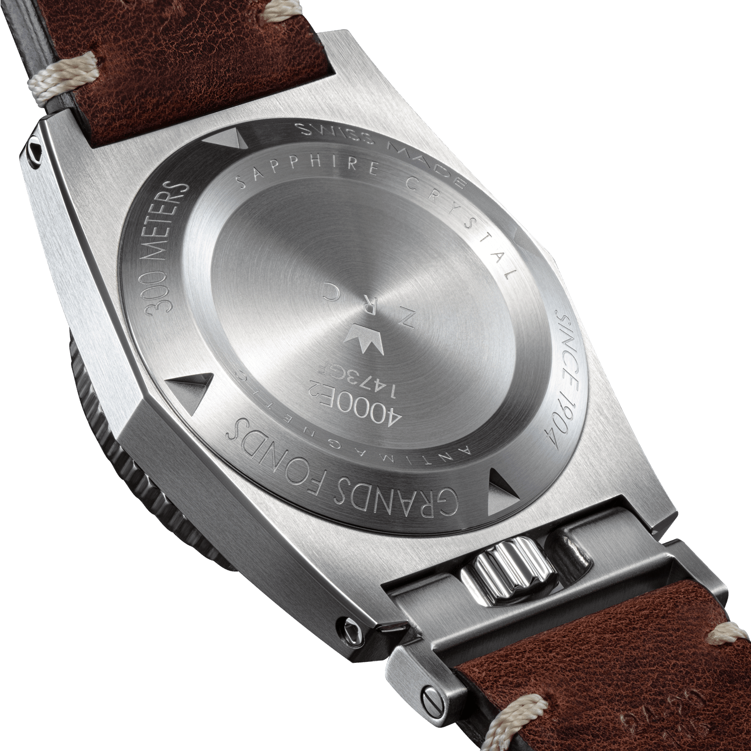 Comfortable brown leather wristband, Super-Luminova® Old radium coated hands and hour markers, and a tropicalized dial are the rule of three for this model with a decidedly vintage sport chic look. Each GF40215 reference displays a unique personality achieved through the original patina of its dial. With its multi-faceted styling and iconic case, the Grands Fonds 300® easily complements a casual outfit or a more elegant wrist. Just like all ZRC® watches, it features optimized ergonomics and the brand’s latest modern innovations such as the unidirectional rotating bezel insert made of scratch-resistant ceramic.