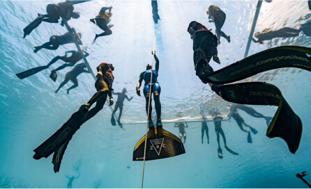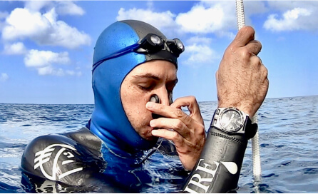 In freediving, his field of excellence, he becomes one with the elements, gliding smoothly through the depths. A member of the French freediving team since 2011, he has entered competition after competition and claimed victory after victory, constantly pushing back the boundaries of depth and time.